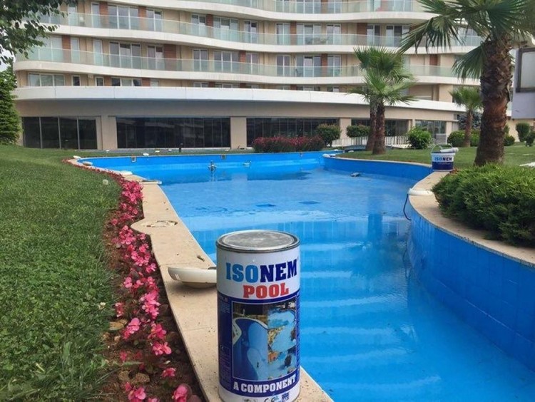 Surface preparation: The surface to be coated must be clean, dry and all impurities that can affect the adhesion like dirt, oil, loose paint or foreign material must be cleaned. Surface repairs, cracks, and gaps should be repaired with ISONEM M 03 Elastic Repair Mortar. Before application of ISONEM POOL, in concrete, marble, granite, raw wood, tile, ceramic etc. surfaces, ISONEM EP PRIMER should be used as a primer with 0,250 - 0,400 kg/m² consumption. In steel/metal surfaces, the surfaced should be primed with ISONEM ANTI RUST PRIMER (Anticorrosive primer), consumption of 0,250 - 0,350 kg/m².